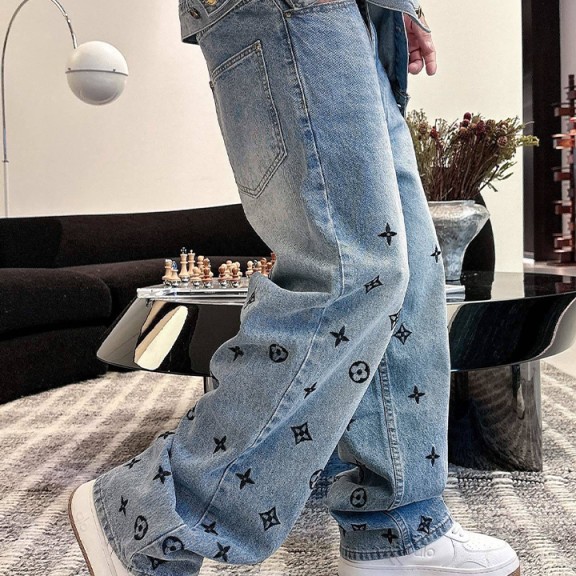 루이비통 3D 자수 모노그램 로고가 전면에 새겨진 새로운 LV 데님 팬츠 > 남성