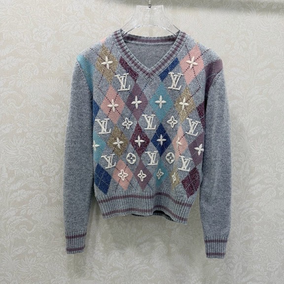 루이비통 3D 자수 로고 다이아몬드 패턴 자카드 스웨터